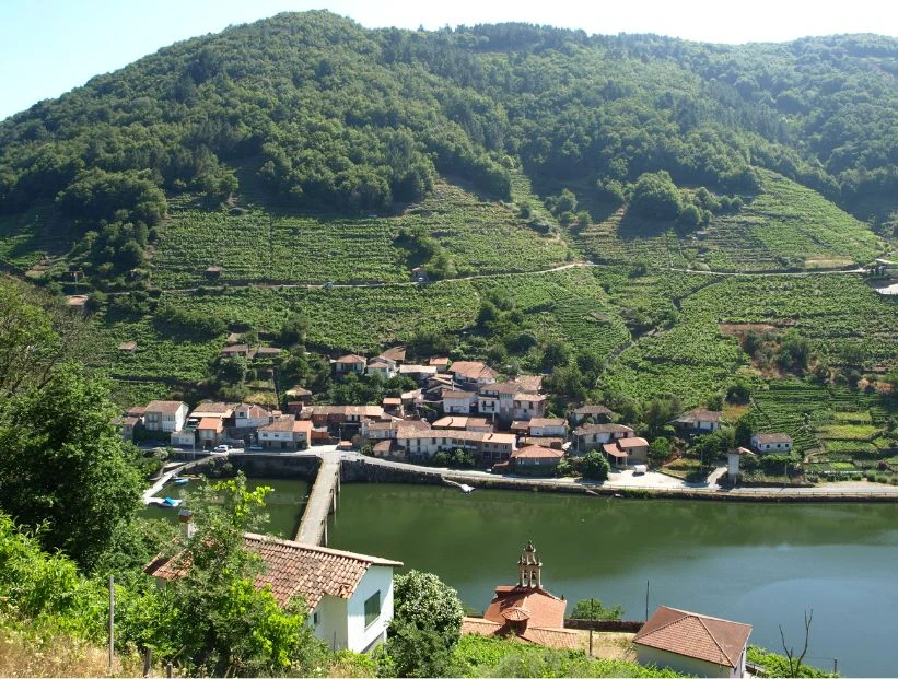 La aldea de Belesar ofrece una naturaleza muy singular: viñedos en bancales escalonados que coronan laderas, reflejos del agua del río Miño, bosque atlántico que se mezcla con tierra de cultivo.