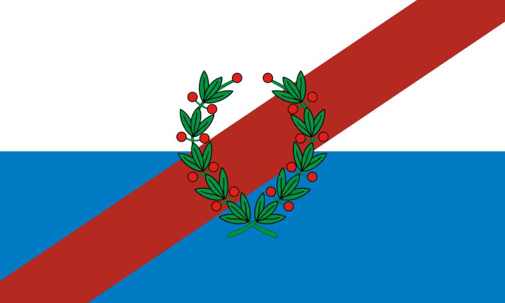 La bandera de La Rioja está conformada por dos franjas horizontales: la superior es blanca y la inferior es celeste, cruzadas por una banda roja que va desde la esquina superior izquierda, hasta la inferior derecha. En el medio hay una corona de laureles florecidos.