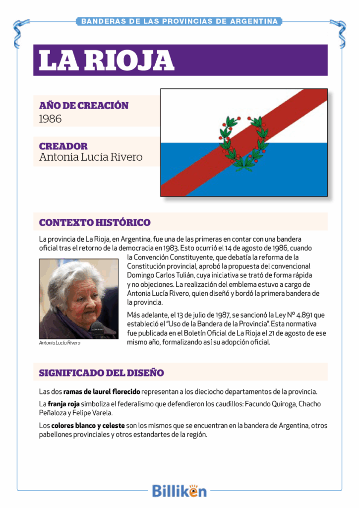 La provincia de La Rioja, en Argentina, fue una de las primeras en contar con una bandera oficial tras el retorno de la democracia en 1983. Esto ocurrió el 14 de agosto de 1986, cuando la Convención Constituyente, que debatía la reforma de la Constitución provincial, aprobó la propuesta del convencional Domingo Carlos Tulián, cuya iniciativa se trató de forma rápida y no objeciones. La realización del emblema estuvo a cargo de Antonia Lucía Rivero, quien diseñó y bordó la primera bandera de la provincia.