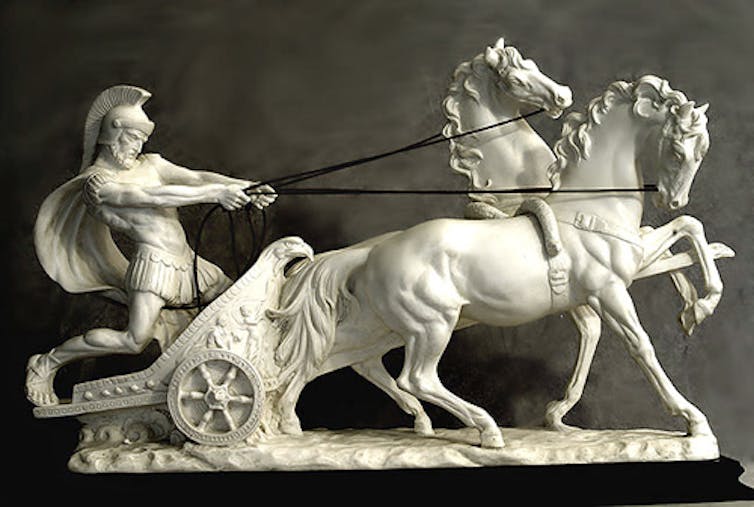 Los caballos del interior iban sujetos al mástil del carro, pero los situados en el exterior se guiaban solo con el correaje. El auriga dirigía los caballos con sus caderas, donde tenía atadas las riendas. De esta forma podía tener libres las manos para utilizar el látigo.