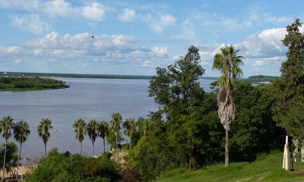 El contraste entre los troncos oscuros de las palmeras, el verde intenso del pasto y el brillo del río Uruguay crea un paisaje inolvidable.